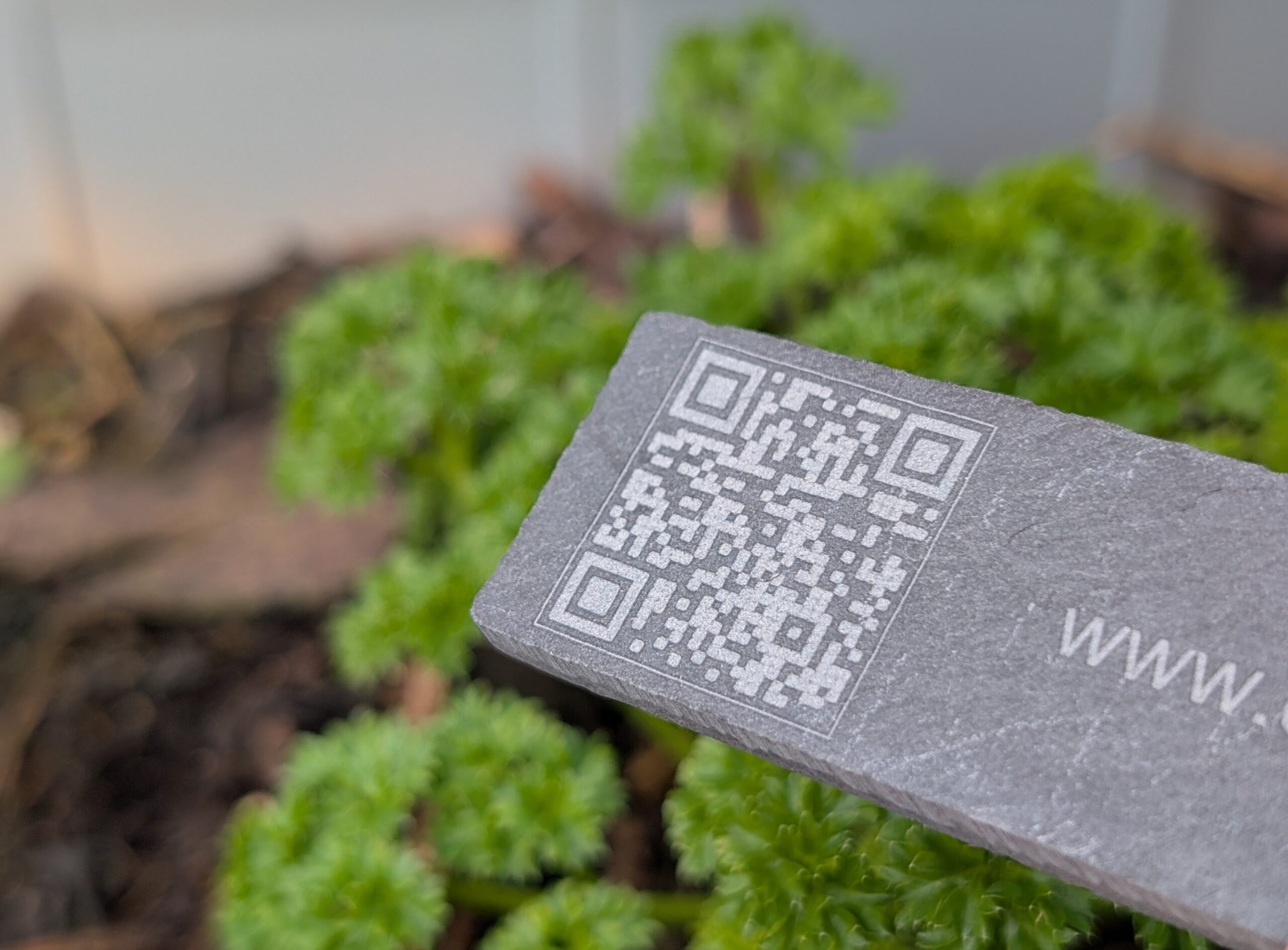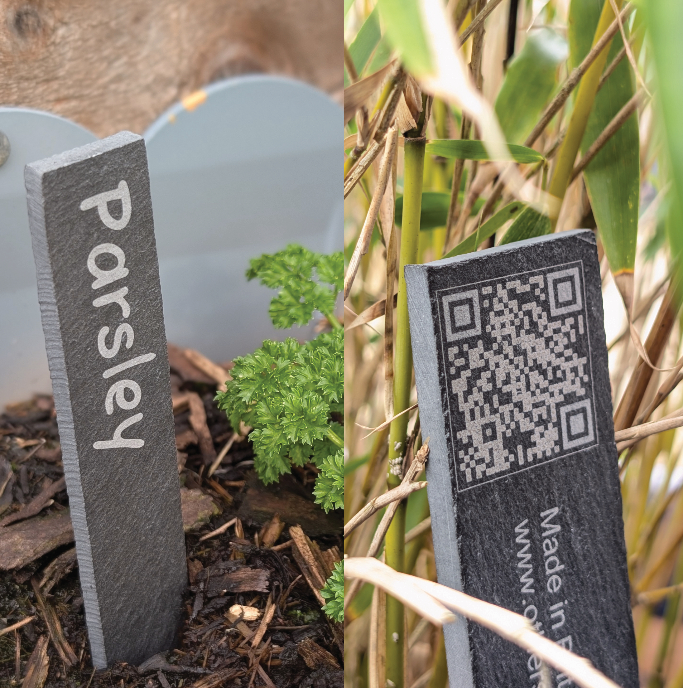 We combine the timeless look of organic slate with modern laser technology. You provide the list of plants in your order, and we precision-engrave the plant name alongside a unique QR code.